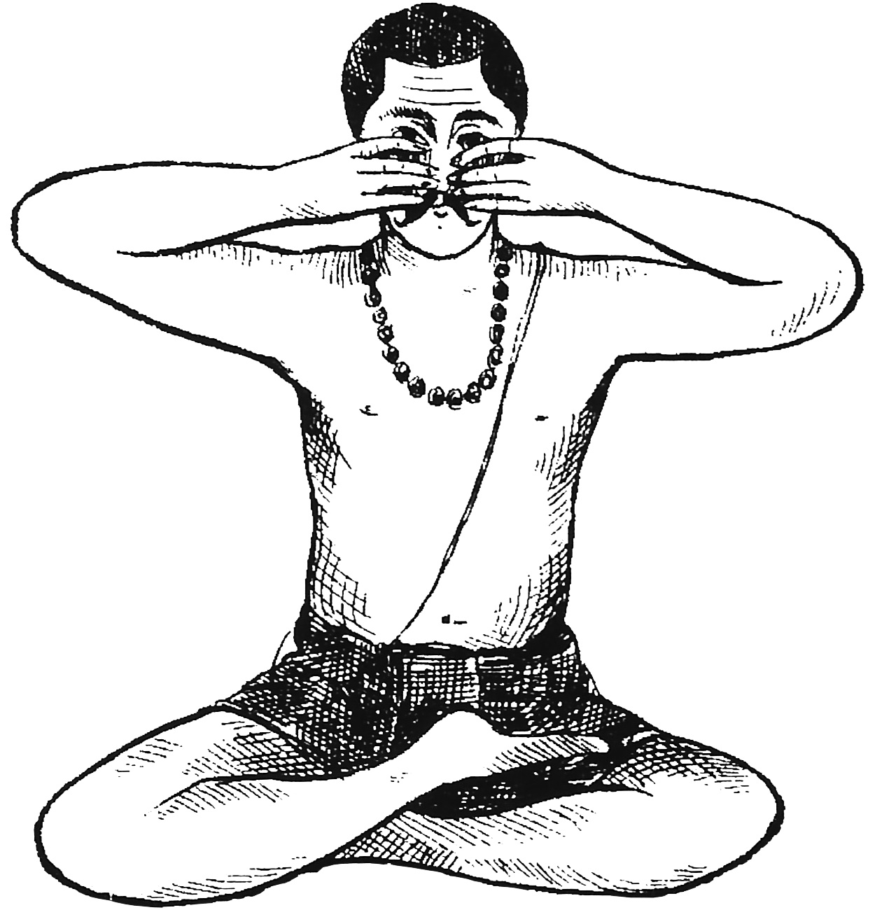 Variante n°3 : Placer le mollet gauche sous le périnée et le pied droit sur la cuisse gauche. Boucher les oreilles avec les pouces, les yeux avec les index et les narines avec les medius. Diriger le regard vers les sourcils et se tenir bien droit. |