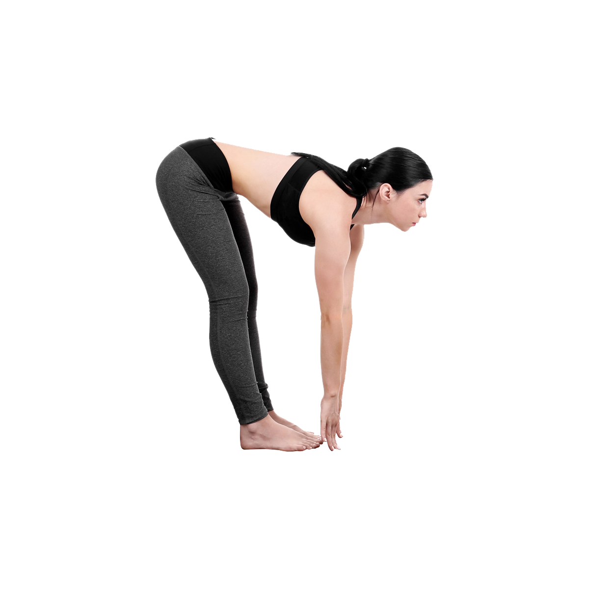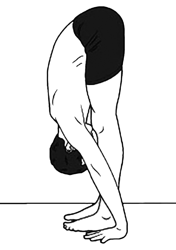 Depuis la position debout, cuisses bien serrées, se pencher en avant jusqu’à toucher les orteils avec les mains. Se pencher davantage et tenir les chevilles ou poser les mains au sol de part et d’autre des pieds. La tête touche les genoux. Cette posture debout conduit à un étirement dorsal. Le corps a la forme d’une épingle à cheveux. |