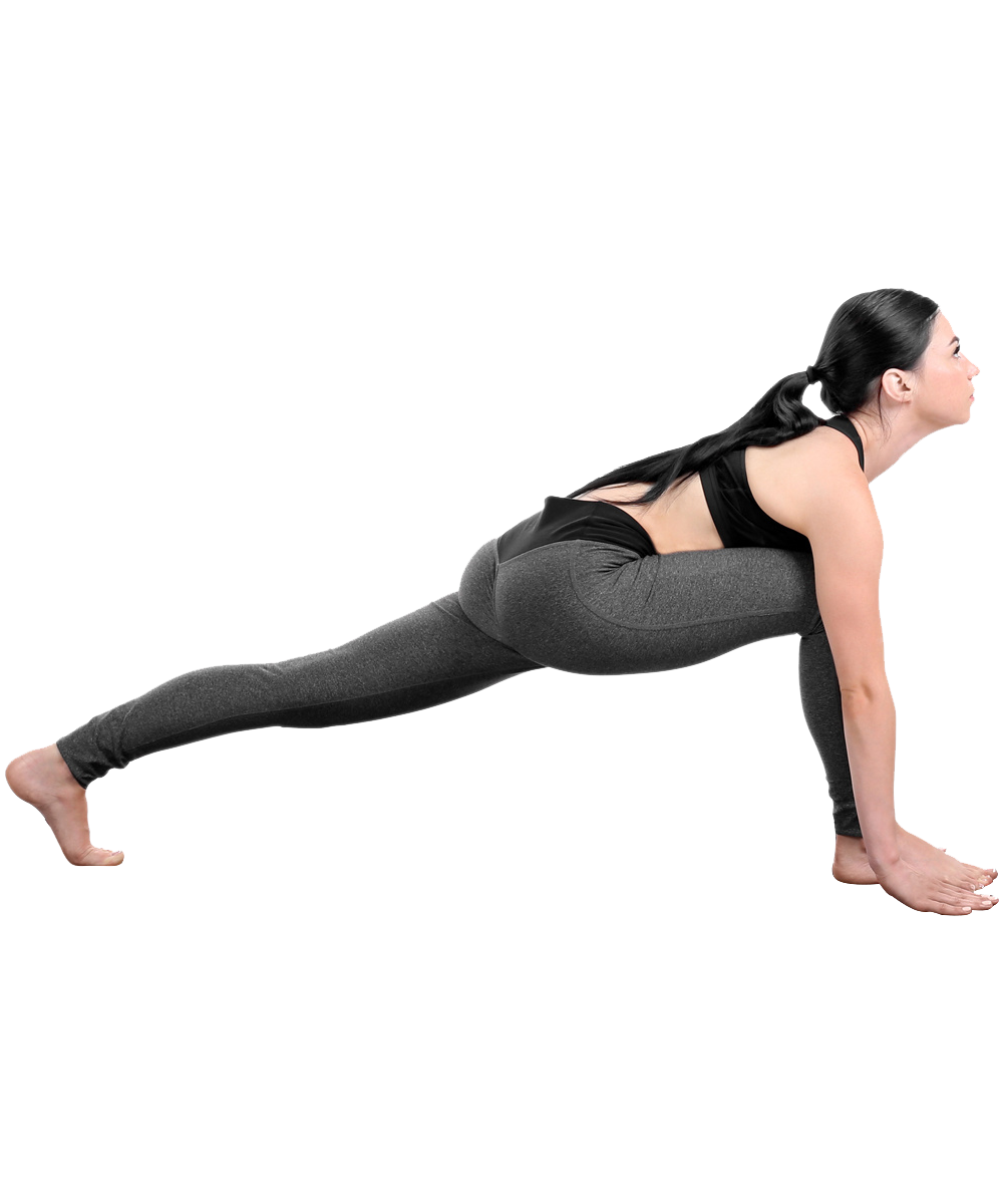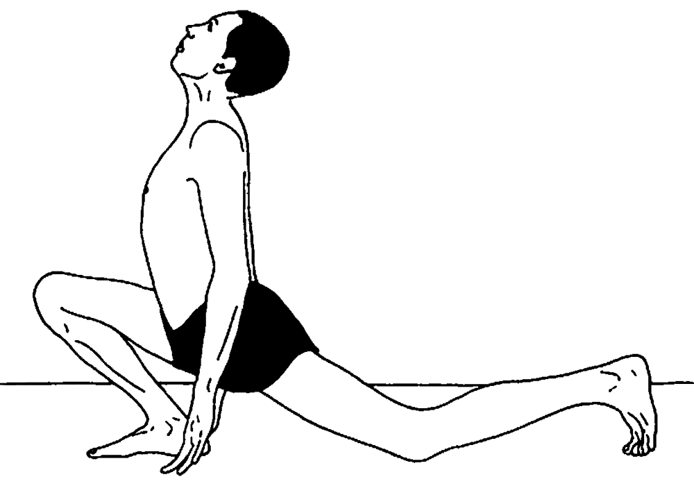 Depuis la position debout, placer la jambe droite loin devant le pied gauche et plier le genou correspondant. La jambe gauche reste bien tendue et les mains reposent au sol, de part et d’autre du pied droit. Lever la tête vers le ciel. |