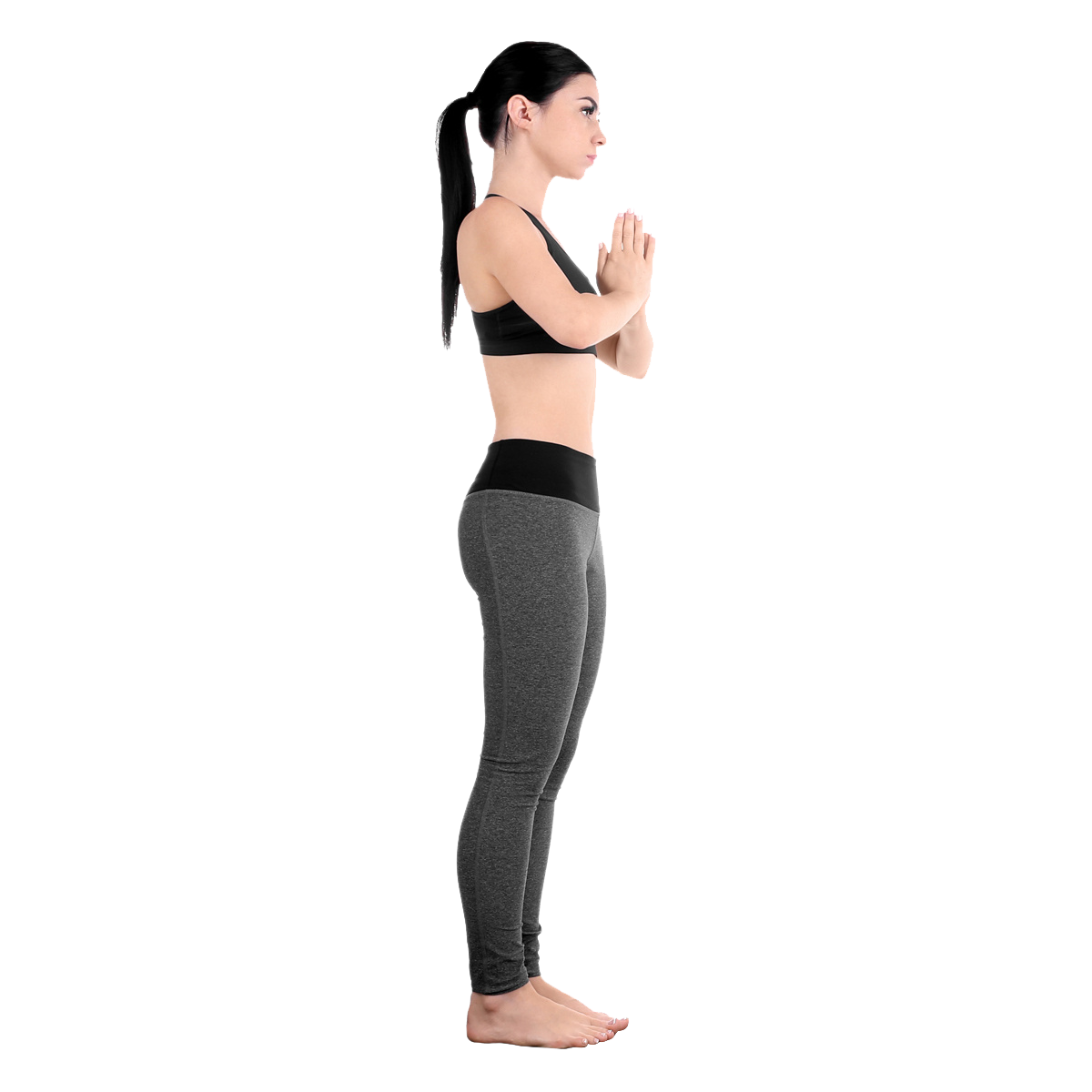 Dans cette posture, le corps est au repos, debout, les mains jointes. C’est une posture de salutation, identique à la première posture. |